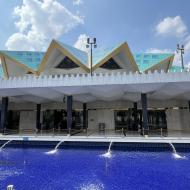 Vi går derefter over gaden for at besøge Masjid Negara, der er Malaysias nationale moske, og hvor der er plads til 15.000 mennesker. Vi bliver iklædt tøj, der dækker arme og ben og for Hannes vedkommende også håret, og med en temperatur på 33 grader bliver det hurtigt meget varmt. Vi sætter skoene og går ind på det flotte område, og her er et imponerende stort bederum, hvor folk sidder i rundkreds og hygger sig. Kvinderne har selvfølgelig deres eget område, hvor vi ikke må komme ind.