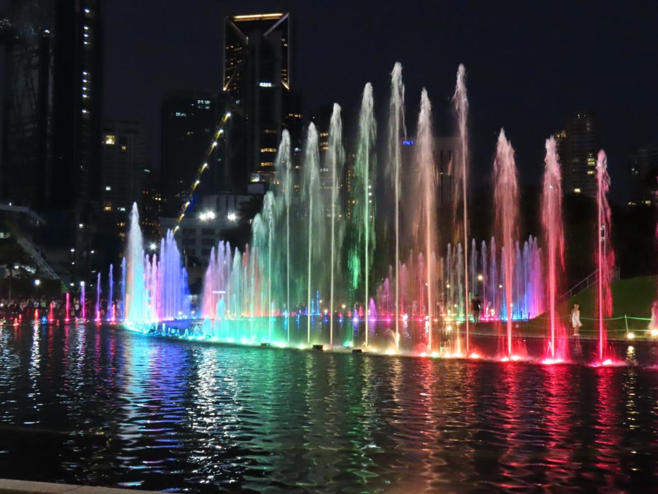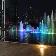 Vores fjerde besøg er en aften, hvor vi ser det farverige KLCC Lake Symphony's Light and Sound Water Fountain Show foran tårnene. Vi har nu set flottere shows andre steder, men det er hyggeligt, og så er det sjovt at se Petronas Towers helt tæt på her om aftenen, da de er lyst op på en helt speciel måde, som kan ses over hele byen.