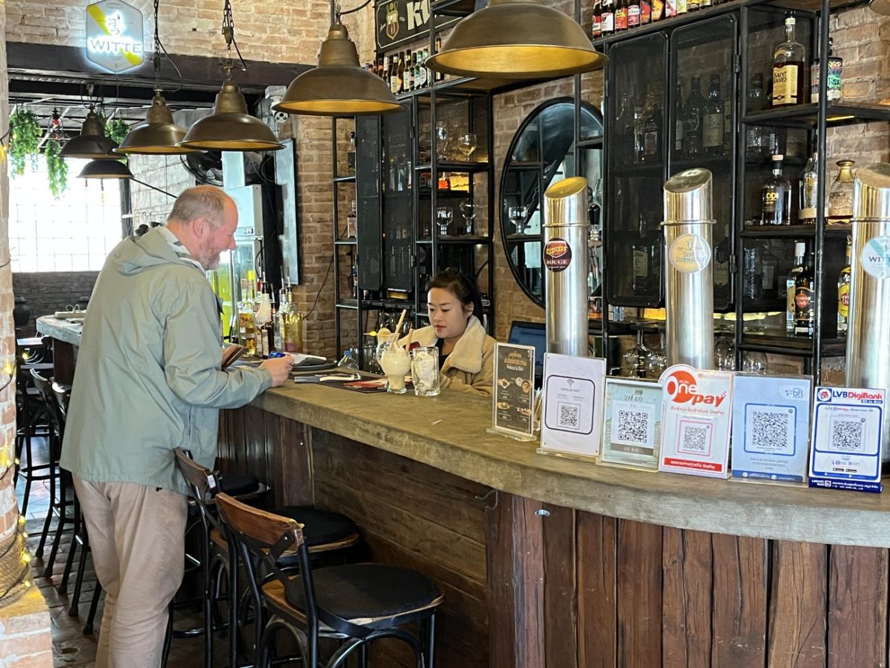 Maolin Tavern ligger på hovedgaden i den del af gaden, der hedder Sisavangvong Rd; det er her, hvor der er flest restauranter og mest liv om aftenen. Det er et rigtig hyggeligt sted med byens største udvalg af øl, og så har de nogle borde på en lille terrasse helt ud til gaden, hvor vi godt kan lide at sidde, da vi her kan følge med i, hvad der sker ude på gaden. Vi spiser her et par gange om aftenen, hvor vi får deres tallerken med skinke, pølse, terrine og oste, men kommer også nogle gange til en øl og en snack om eftermiddagen. Vi prøver lidt forskellige øl, og Jens Peter bliver især glad for den belgiske øl Kasteel Donker på 11%, som dog er lidt for sød til Hanne.