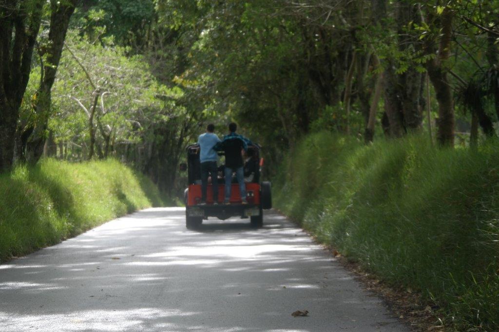 Onsdag tager vi en jeep inde fra torvet kl. 9 ud til nationalparken Valle de Cocora. Vi er de første, der køber billet, så vi får lov at sidde på forsædet. Der er et pænt stykke derud, men vejen er i god stand, så køreturen er behagelig nok. Foran os kører en jeep, hvor der står et par fyre på trinbrættet bagpå, og det havde vi nok ikke lige klaret.