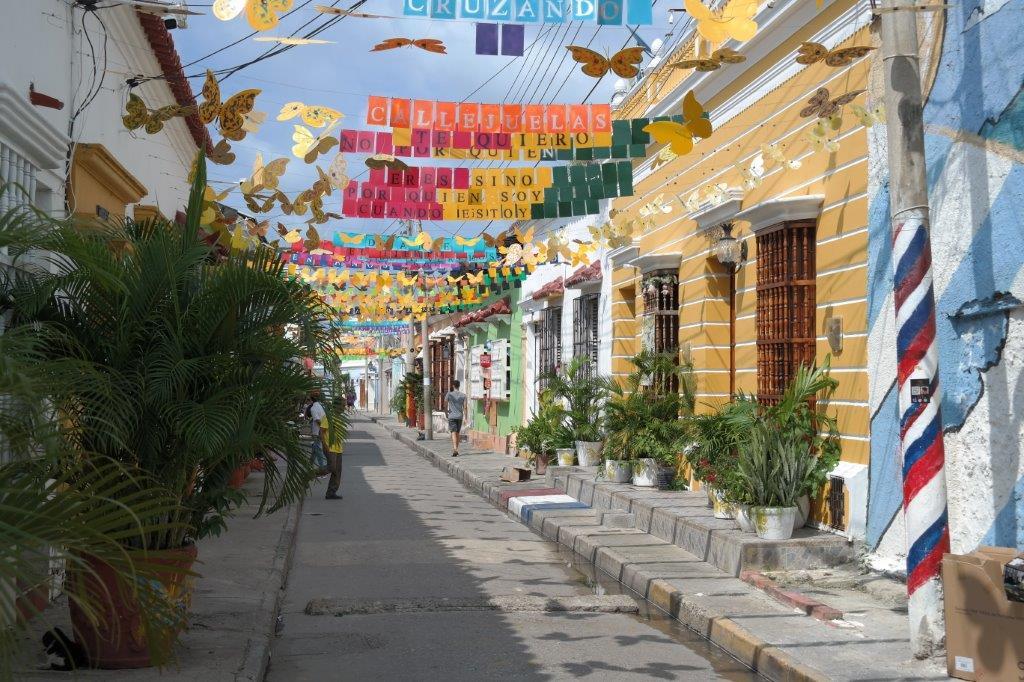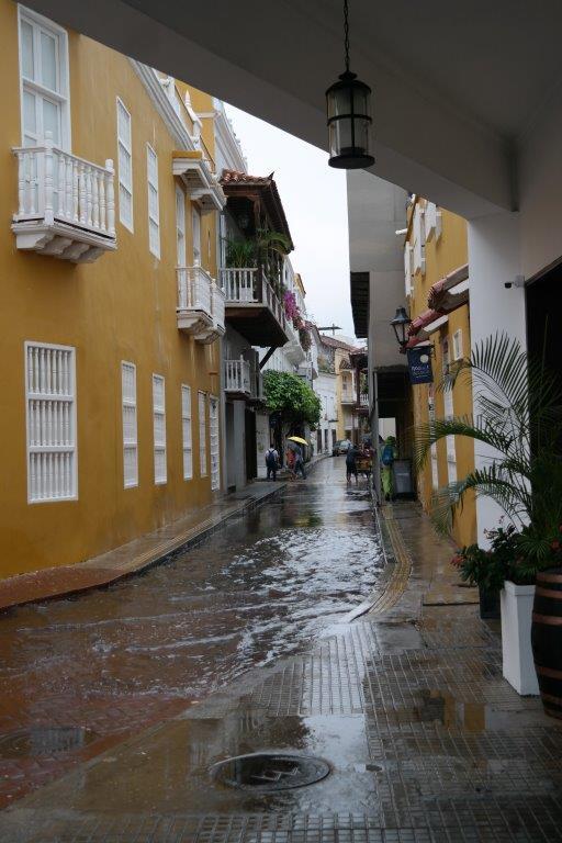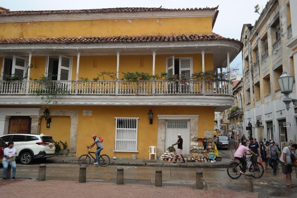 Resten af dagen går vi rundt på bymuren, hvor der er en fin udsigt til den rige bydel Boca Grande med skyskrabere ud til vandet, og i de mange smalle gader, hvor husene er rigtig flotte med smukke balkoner og andet træskærerarbejde samt masser af blomster. Vi får en god frokost på en restaurant, hvor vi bliver siddende lidt, da det regner igen, og senere tager vi noget at drikke på hotellet Sofitel, som tidligere var et kloster, Santa Clara. Der er i hele området desværre rigtig mange gadesælgere, som er meget pågående, og byen virker i det hele taget en del fattigere end Medellín. En af de tjenere, vi snakker med, siger også, at der er stor fattigdom, så snart man er uden for bymuren.