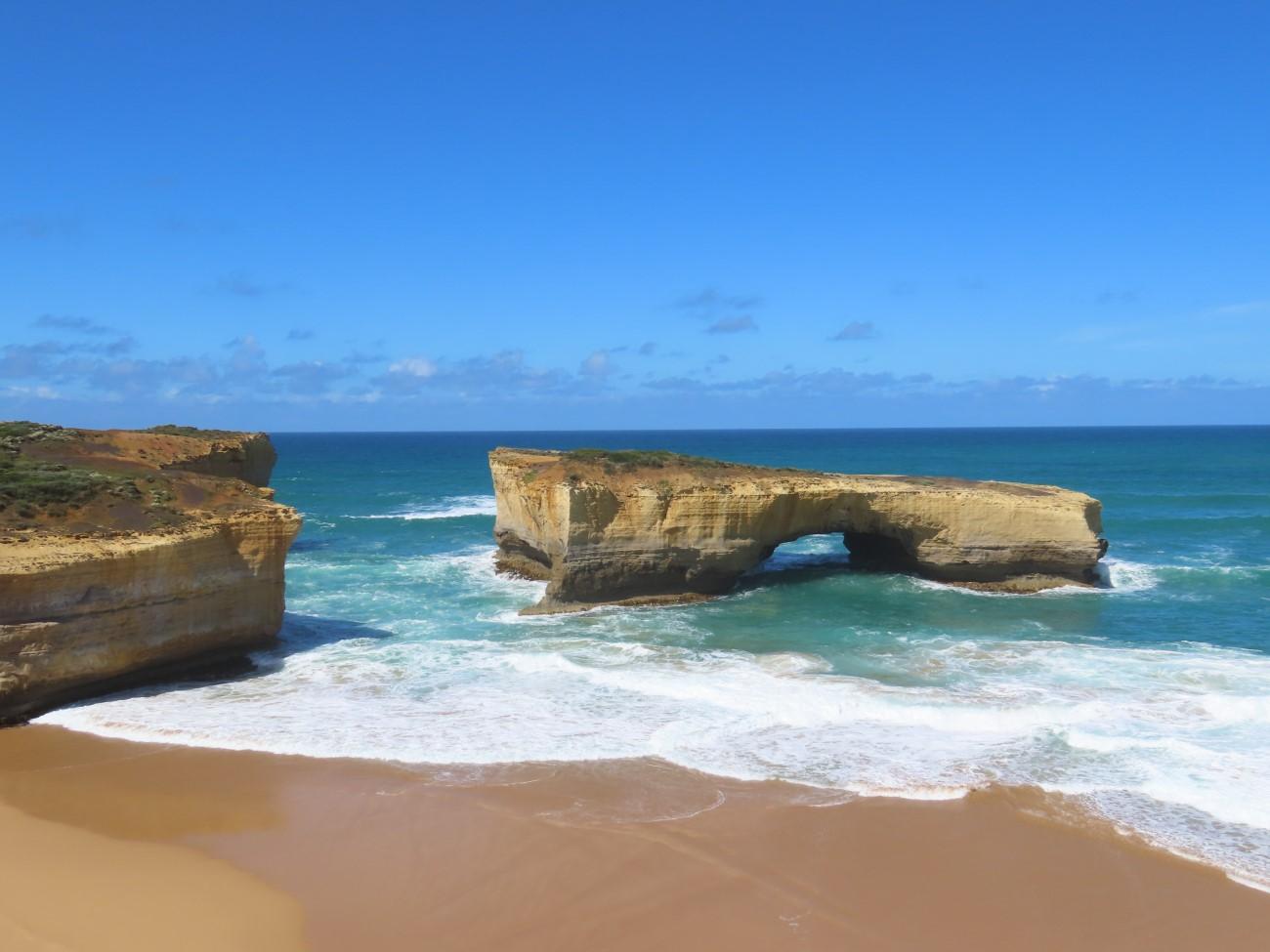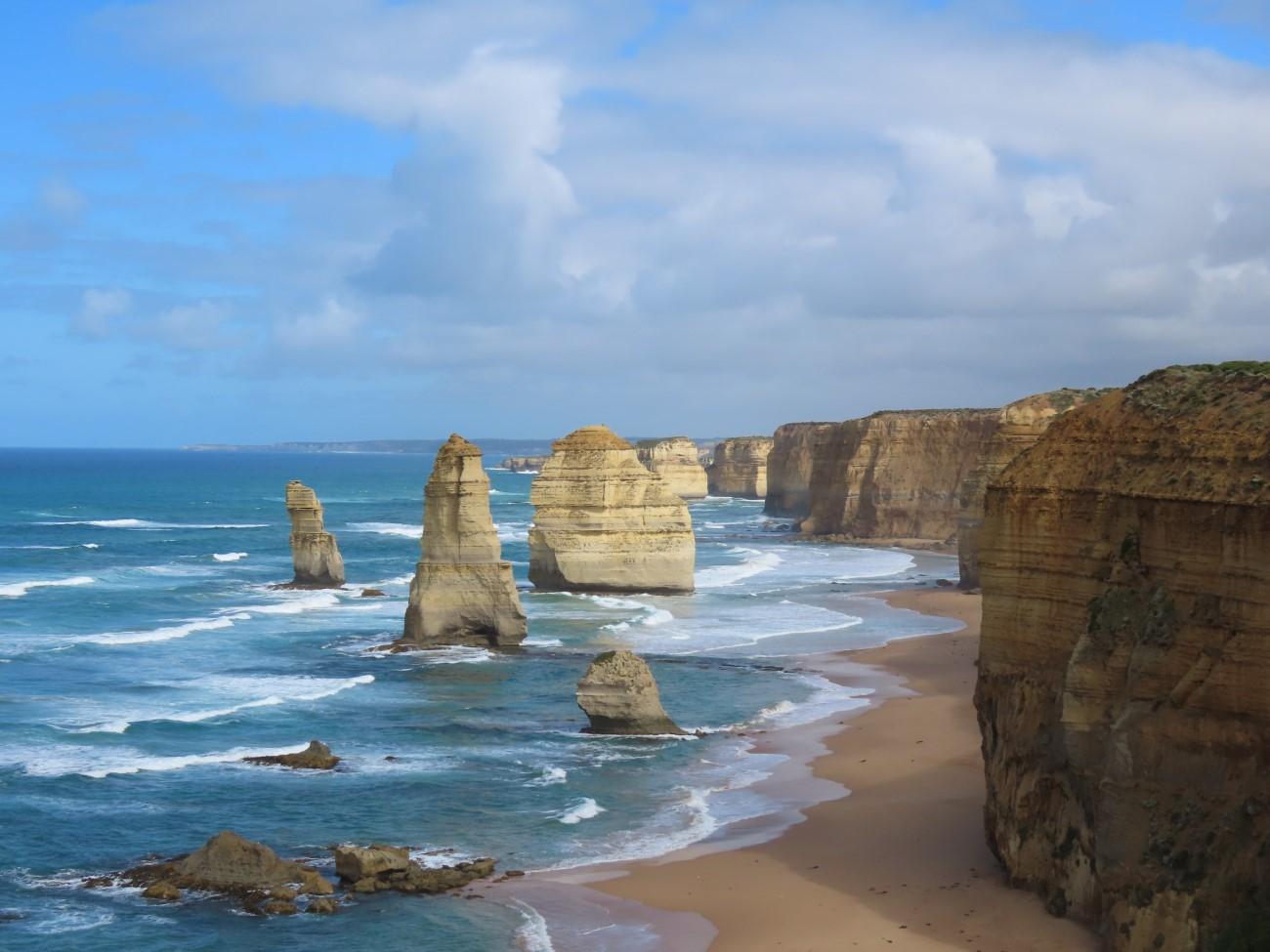 Twelve Apostles, De Tolv Apostle, er en række kalkstensstabler, som står tæt på kysten, og der er lavet en gangbro, så man rigtig kan nyde udsigten. Flere af dem er med tiden styrtet i havet, så der er vist kun otte tilbage, men det gør dem nu ikke mindre imponerende. Vi kommer heldigvis forholdsvis tidligt, så der er ikke så mange besøgende endnu, og vi er heldige, at solen rammer alle klipperne, lige inden vi tager videre.