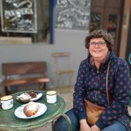Vi tager som regel en café con leche (kaffe med mælk), som er rigtig god, og dertil får Jens Peter en snegl med chokolade, og Hanne får en croissant med mandler og creme. Begge kager er meget store og smager virkelig godt, og de har også nogle gode flute, som vi køber med hjem nogle gange.