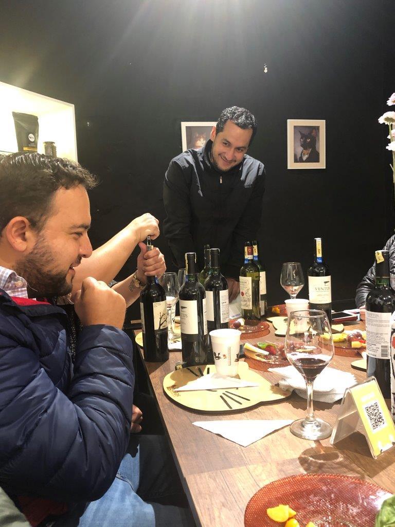 Ugen efter er der vinsmagning, så den tilmelder vi os også. Denne gang er vi ni deltagere, og vi sidder i det rum, som tidligere har været carport, hvilket vil sige, at der er åbent i den ene ende. Det er temmelig koldt, men vi har heldigvis tager godt med tøj på. Ud over os deltager Santiago og Hillins, Hillins’ mor og deres to venner samt Ash, som kommer fra Utah, og hans kæreste her fra Ecuador – de har mødt hinanden for nylig. Vinene kommer fra Argentina og Chile, men der er lagt mere vægt på, at de skal være specielle end gode; bl.a. smager vi en argentinsk rødvin fra Patagonien, som er alt for let til os. Vi har dog en rigtig dejlig aften, da vi hygger os meget med de andre. Det er her, vi lærer Santiago og Hillins at kende, og vi får også snakket med Ash, som er i gang med at etablere en bogcafé på Galápagos. Han hjælper os efterfølgende med at formidle kontakten til en guide, som finder en tur til os, da vi tager dertil. Vi får lidt ost og skinke til smagningen, og vi bestiller efterfølgende lidt mere, da vi ikke har lyst til at gå hjem. Vi får hver en flaske rødvin, desværre den fra Patagonien, og den ene flaske får vi tømt, inden Tres Gatos til sidst pænt beder os om at gå, da de vist har lukket for længst. Hanne kan heller ikke tåle mere på det tidspunkt.