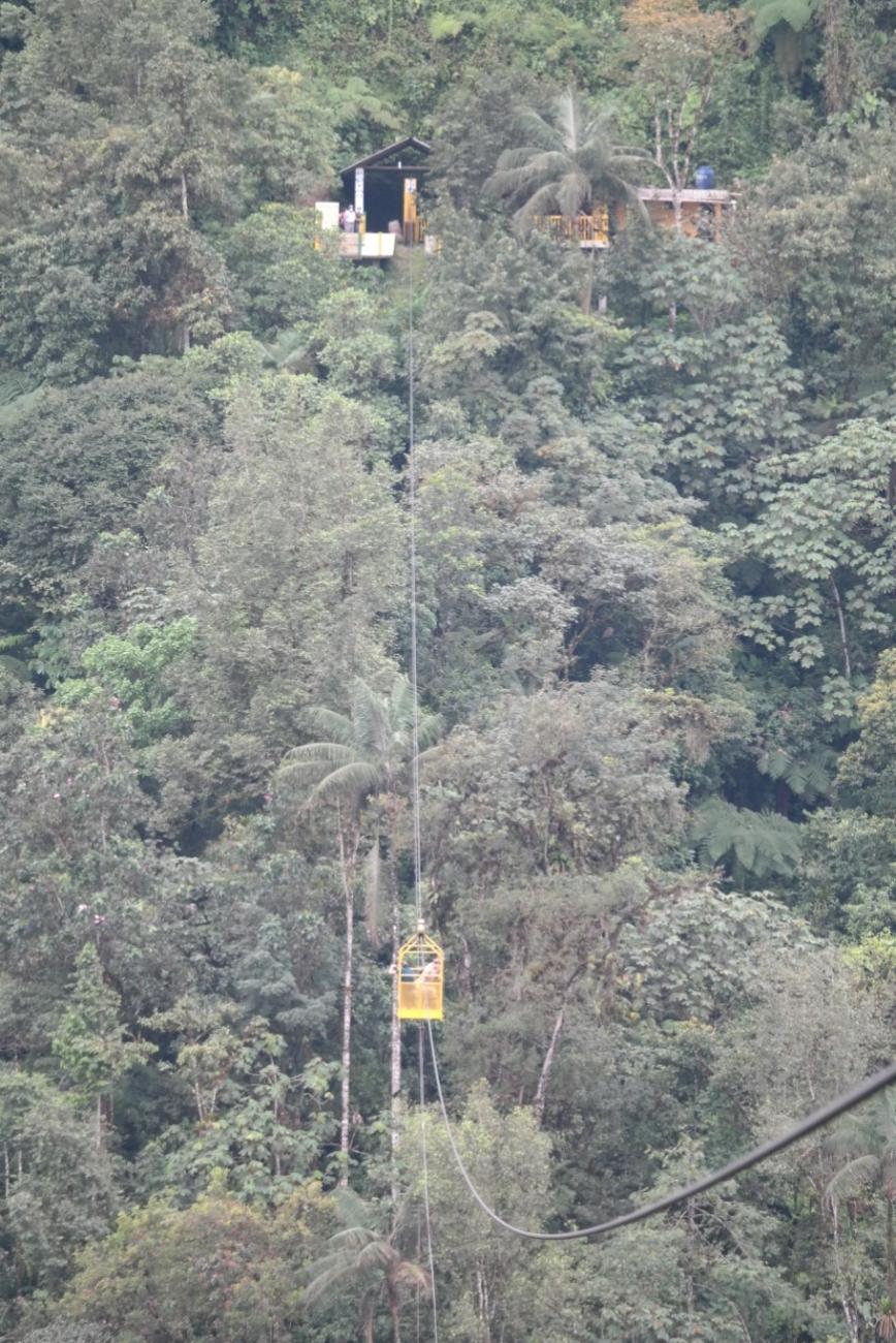 Efter besøg hos kolibrierne kører vi til Mindo by og derfra ud i skoven ad en virkelig dårlig vej. Vi parkerer bilen og starter med at tage en lille svævebane hen over en flod og går derefter ad en smal sti ned til floden og et lille vandfald. Man kan godt mærke, at man er i, hvad der svarer til en regnskov, da her er meget fugtigt, og der gror svampe på træstammerne flere steder; her er mange typer træer og blomster, bl.a. orkideer. Vi kommer ned til floden, som vi krydser ved at gå over en bro, og vi ser vandfaldet, som nu ikke er noget særligt. På et tidspunkt kalder Carlos på os, da han kan se en tukan – Jens Peter når at se den, men det gør Hanne desværre ikke.
