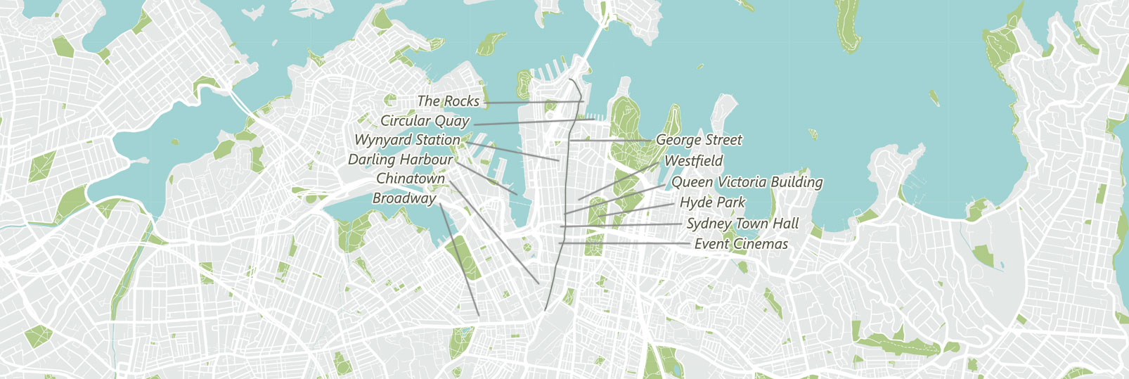 Den mest kendte vej fra Haymarket i syd til The Rocks i nord er George Street. Her kører letbanen, og undervejs kommer man forbi Event Cinemas, byens rådhus, Queen Victoria Building med togstationen Town Hall og lidt længere nordpå togstationen Wynyard. Øst for Queen Victoria Building ligger indkøbscenteret Westfield med Sydney Tower Eye, den lille gågade Pitt Street Mall og den smukke arkade The Strand Arcade fra 1892. Går man lidt længere østpå, kommer man til den smukke park Hyde Park, som har nogle rigtig flotte træer og ligger lige ved siden af St Mary's Cathedral.