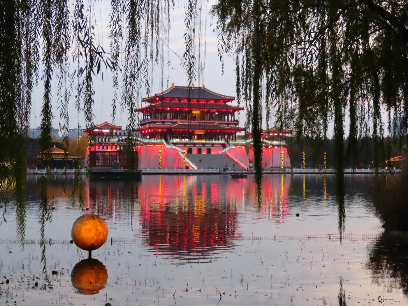 Hvis du har mere end nogle få dage i Xi’an, kan vi anbefale et besøg i Tang Paradise, der er en meget stor park ca. 6 km syd for den gamle by. Her er en kæmpe sø, flotte bygninger og kanaler, forskellige former for underholdning og ikke mindst en meget smuk søjlegang. Vi anbefaler, at man kommer om eftermiddagen og bliver indtil solnedgang.
